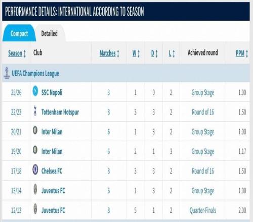 北京时间10月22日,欧冠精英联赛第三轮,那不勒斯客场对阵埃因霍温,最终那不勒斯在客场2-6不敌埃因霍温。据统计,这是孔蒂带队的第45场欧冠联赛,他共计取得16胜14平15负,胜率为35.6%